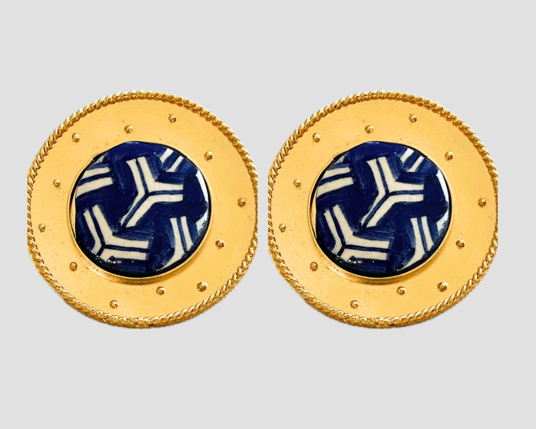 Aretes elaborados en bronce con baño de oro de 24k; decorados con un disco en cerámica del Carmen de Viboral; pintados a mano.