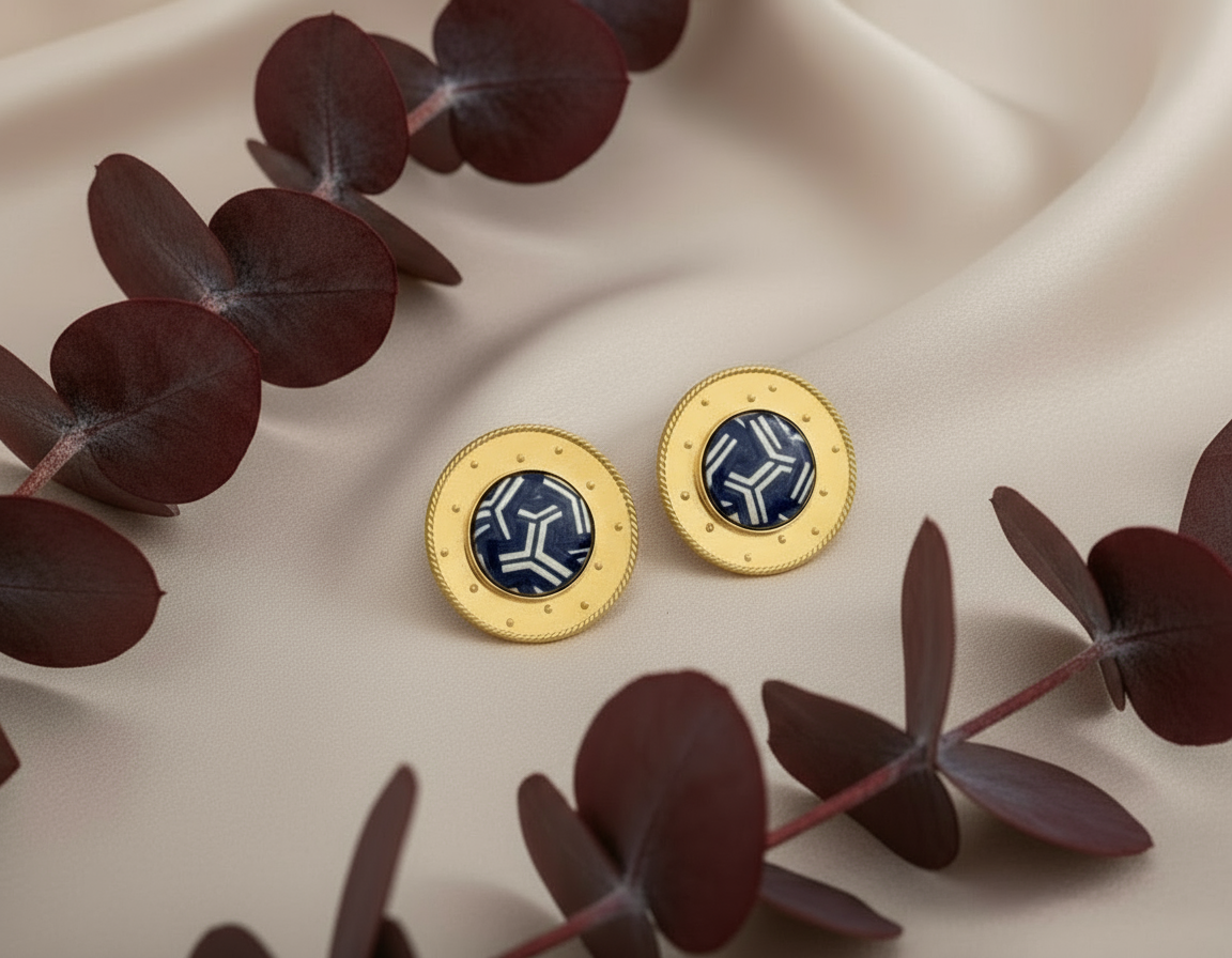 Aretes elaborados en bronce con baño de oro de 24k; decorados con un disco en cerámica del Carmen de Viboral; pintados a mano, diámetro de 5 cms.