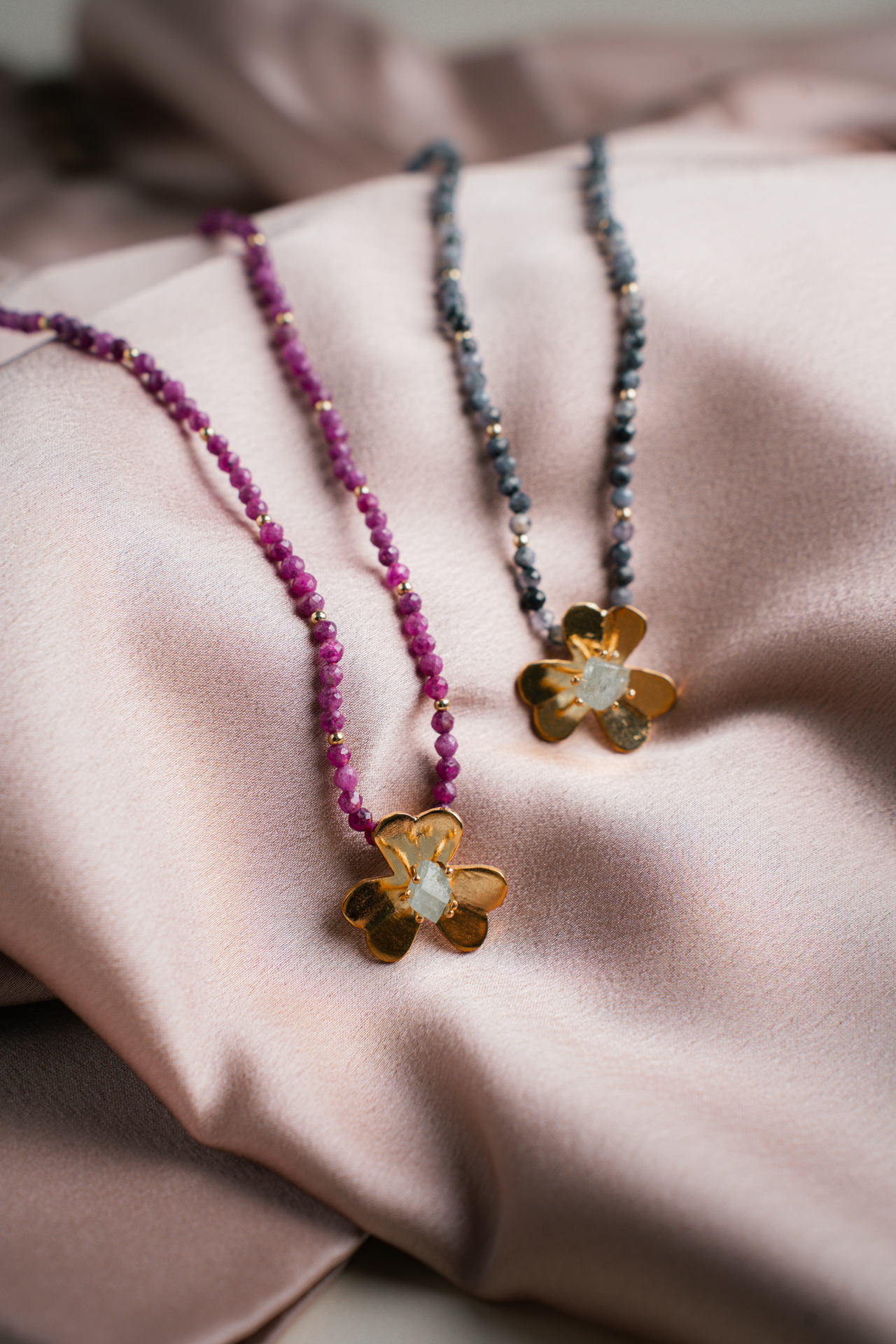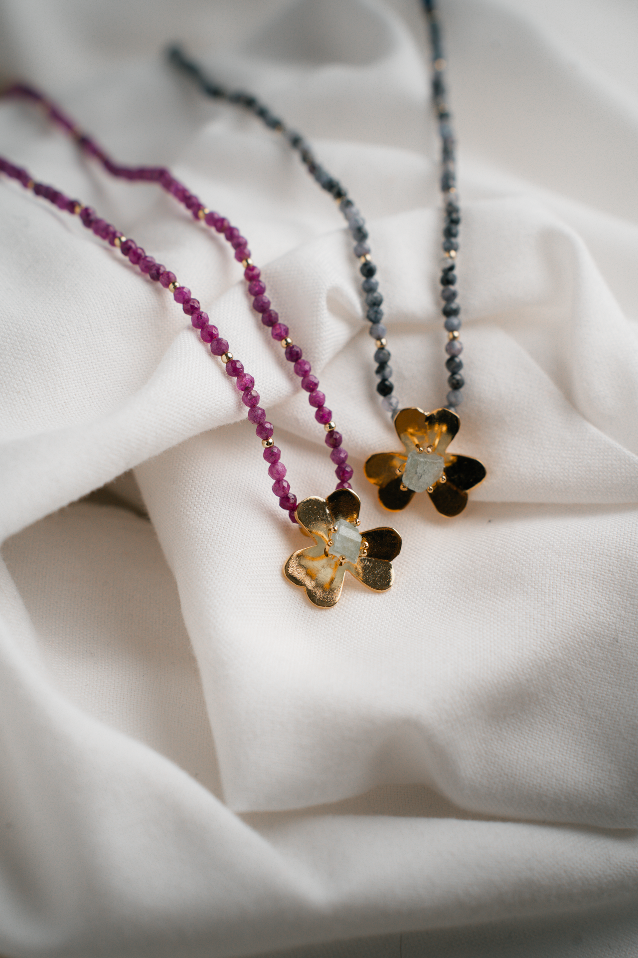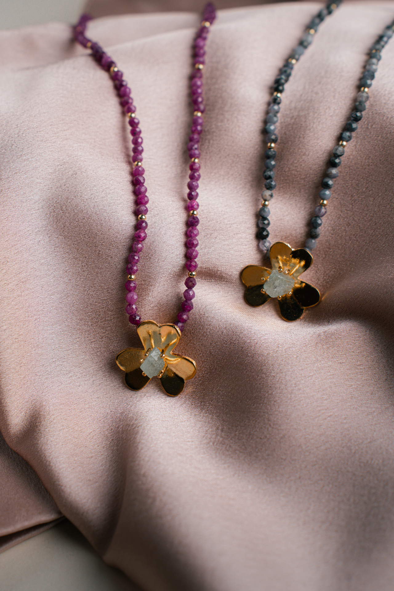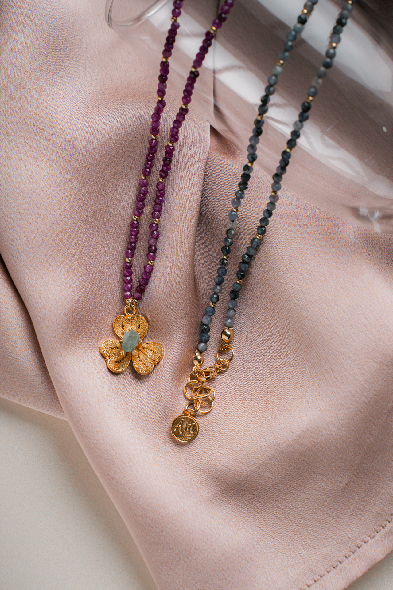 - Delicado collar, elaborado en piedras preciosas rústicas, rubí y zafiro.