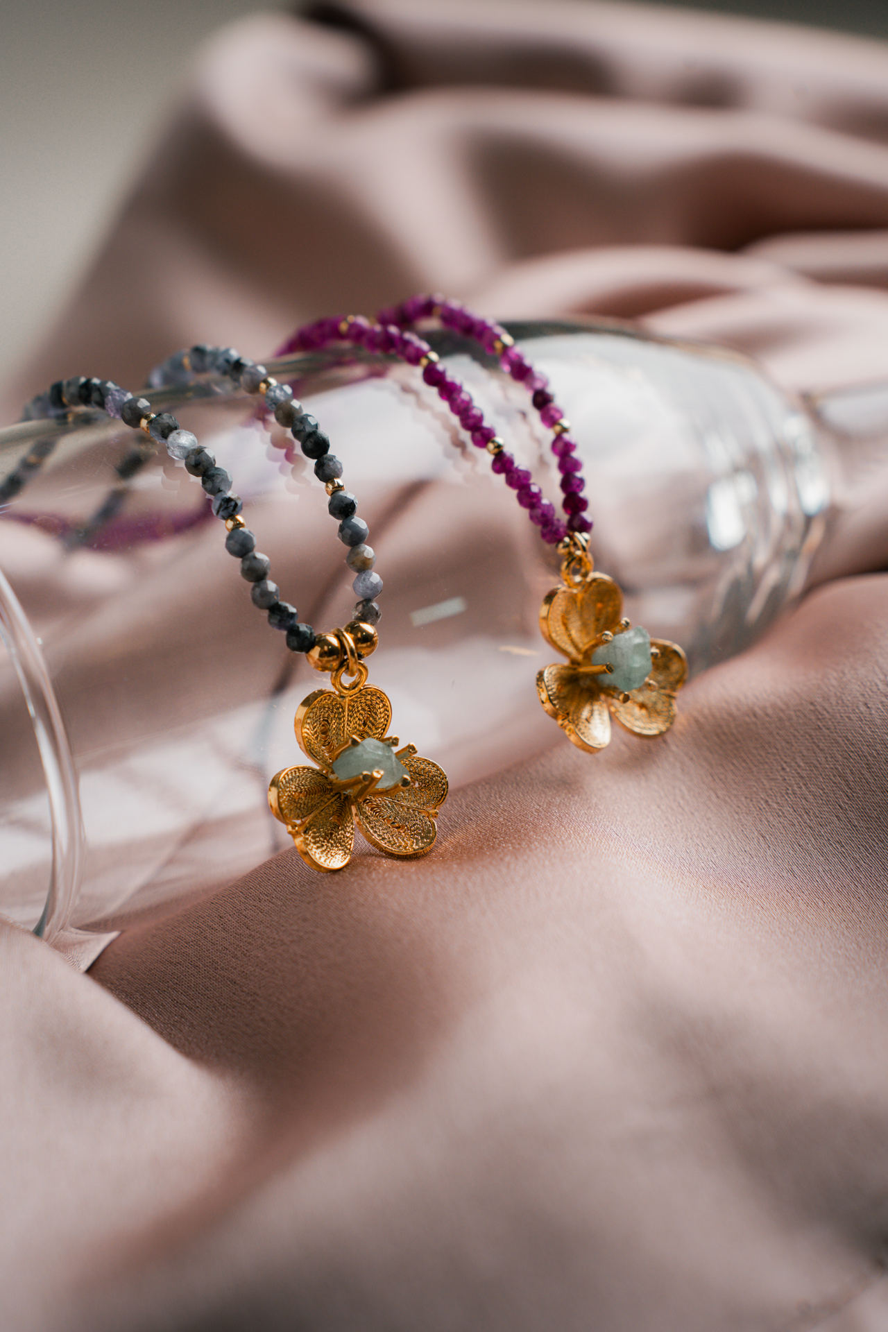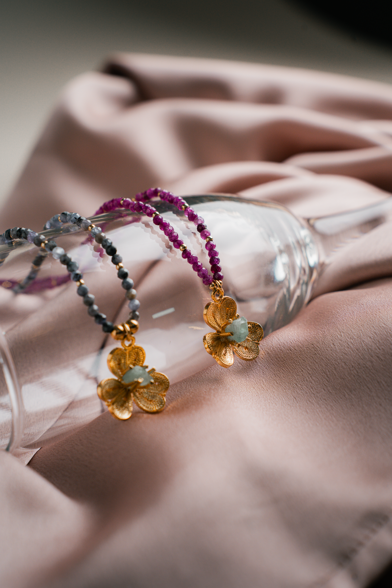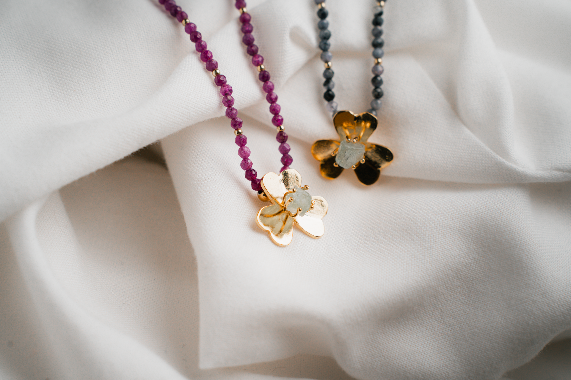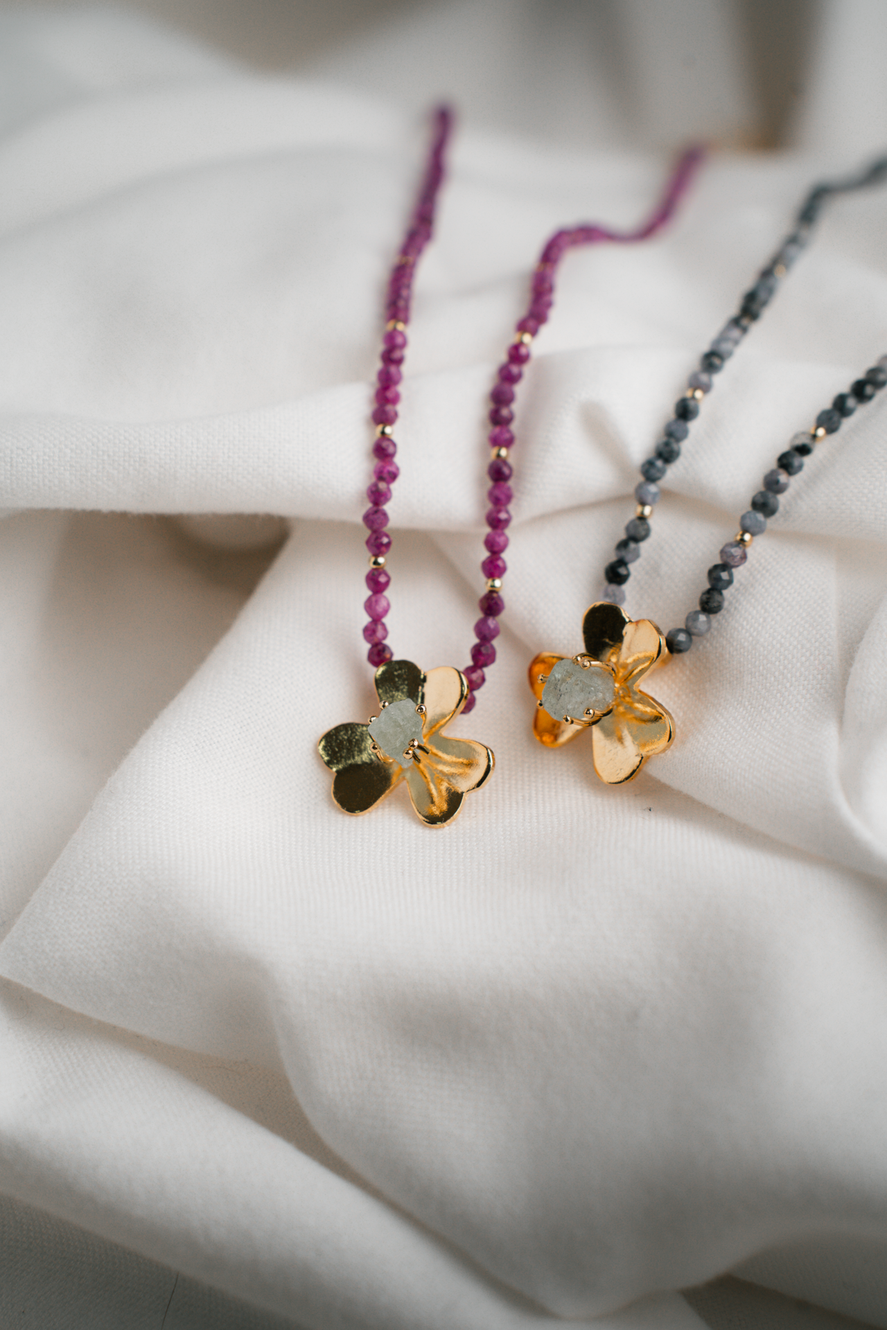 - Delicado collar, elaborado en piedras preciosas rústicas, rubí y zafiro.