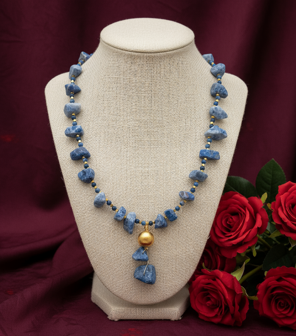 Collar elaborado en piedra semipreciosa, lapislázuli rústica y detalles dorados.